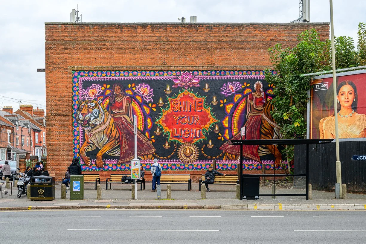 As part of the We Bring Light project, we have created a large-scale mural on Belgrave Rd, called Shine Your Light. Belgrave Road sits at the heart of the festival, and is where thousands of people have gathered each year for the Diwali lights switch-on, which started in 1983, 42 years ago.